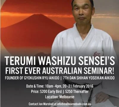 WASHIZU Terumi, fondateur de l'Aïkido Gyokushin Ryu et sommité en techniques sutemi, réalisera son premier séminaire en Australie, les 20 et 21 février 2016.